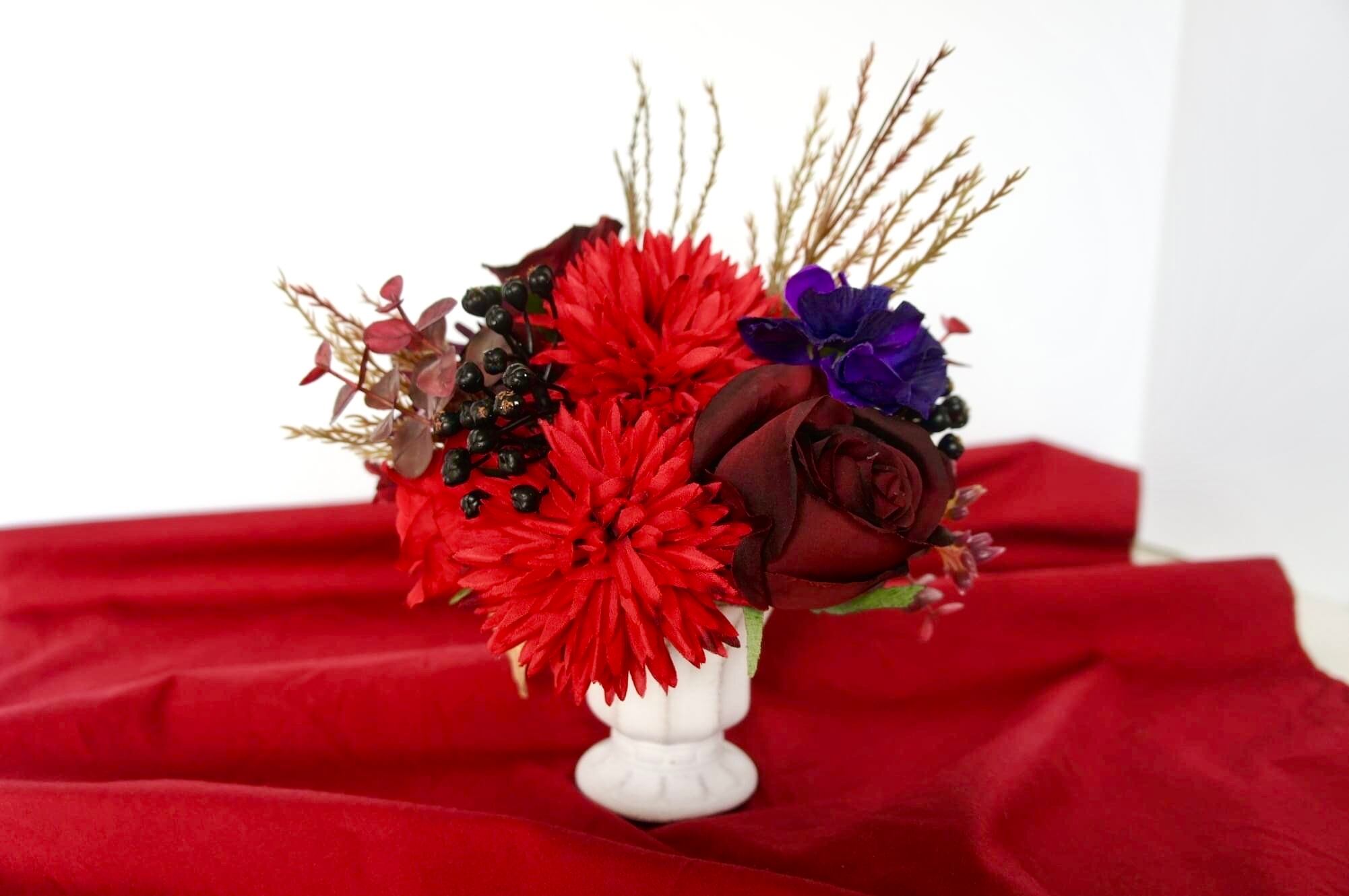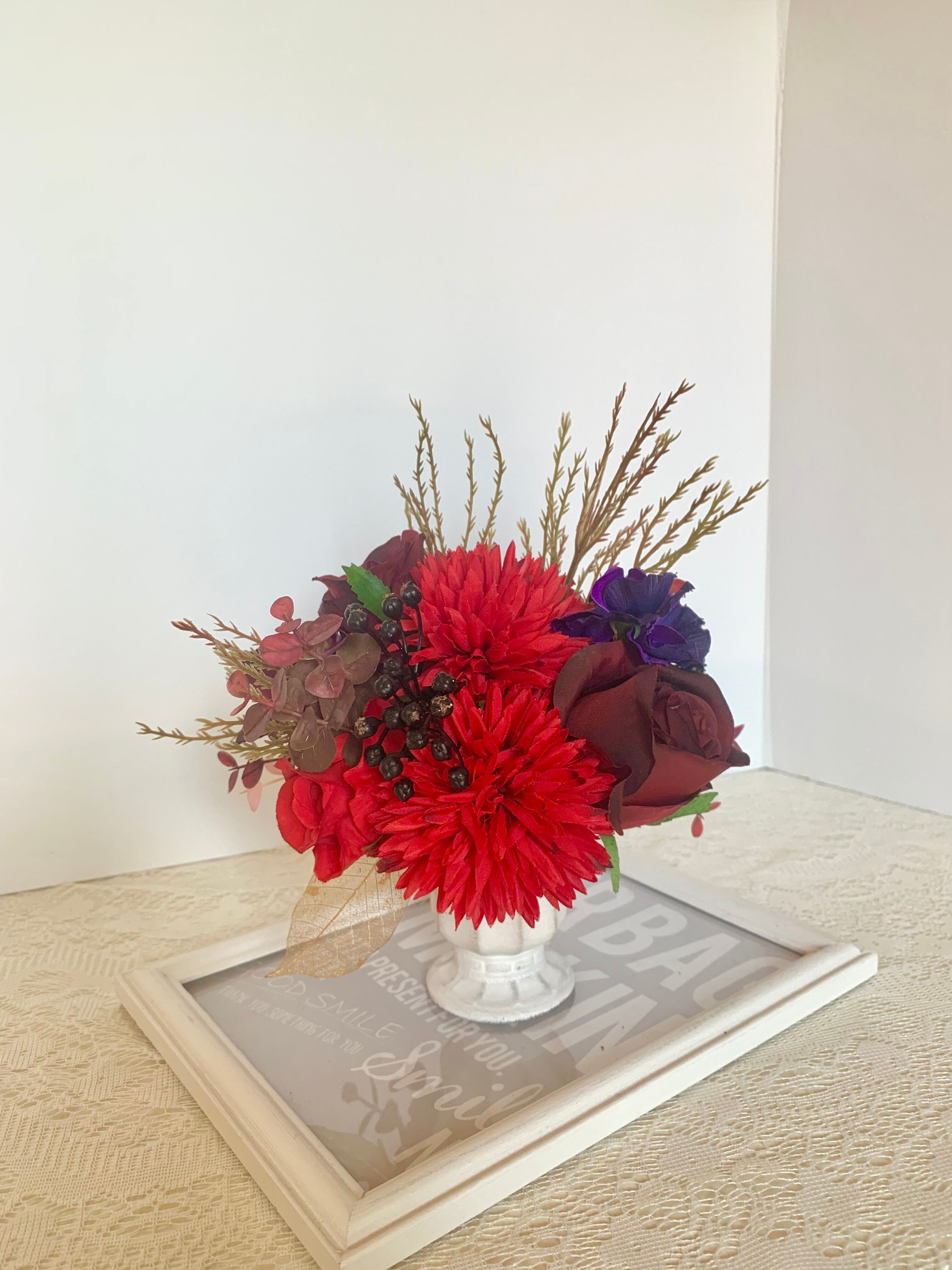 クラシックな花器に、マムとローズを中心に赤を基調としたアレンジです。