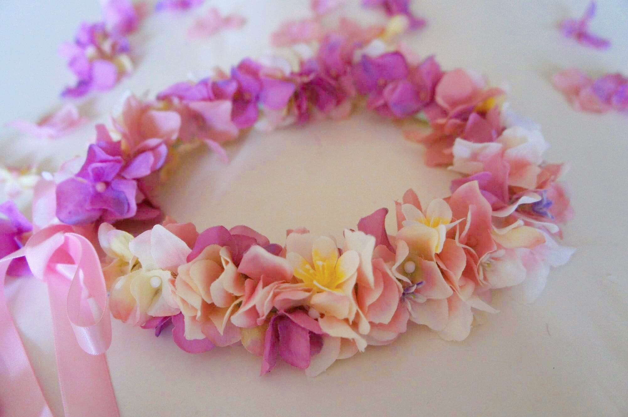 パープルピンク系のアジサイをメインに仕上げた花冠です。