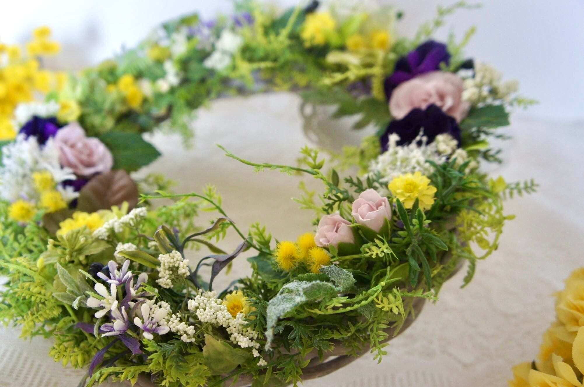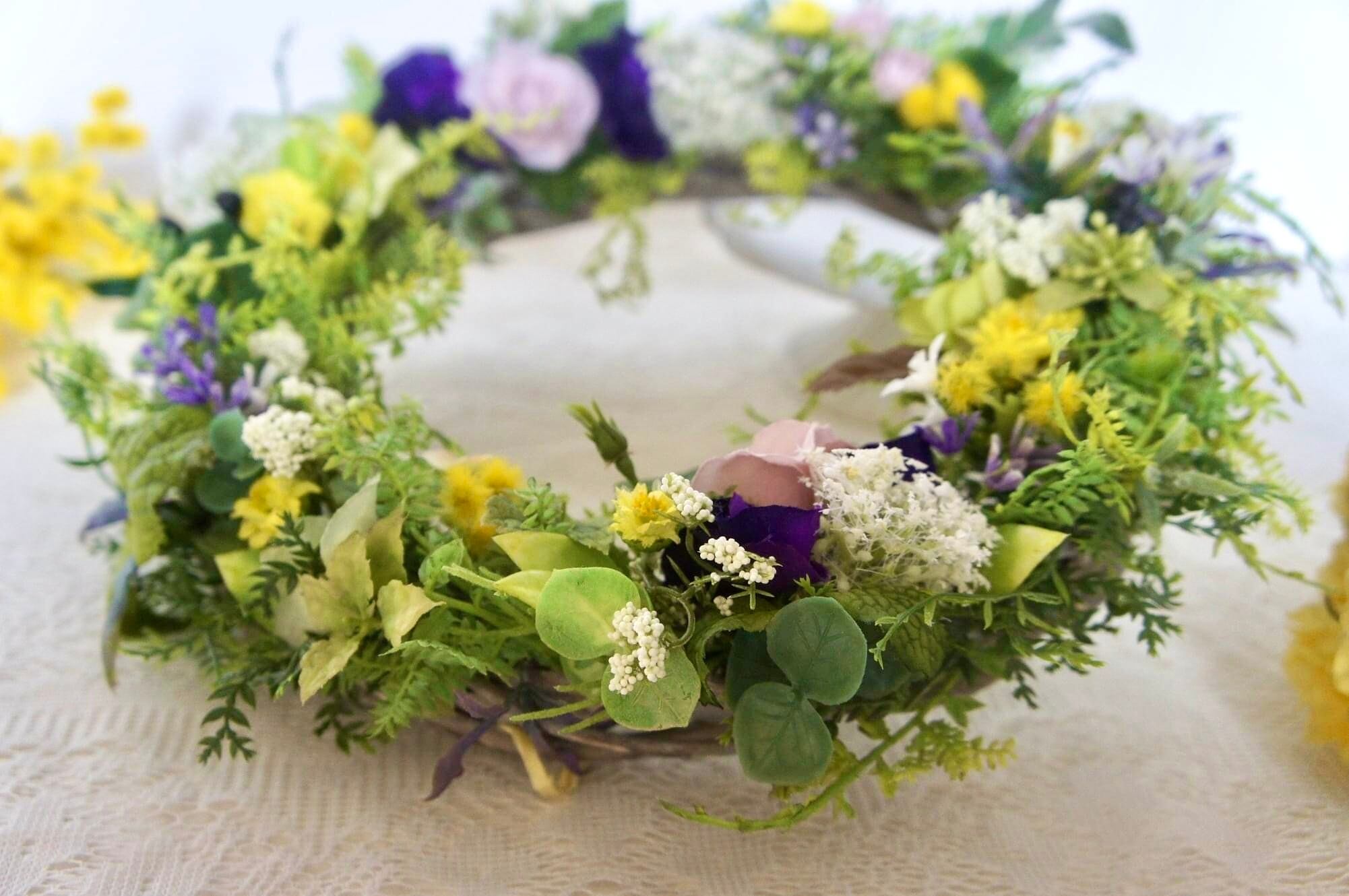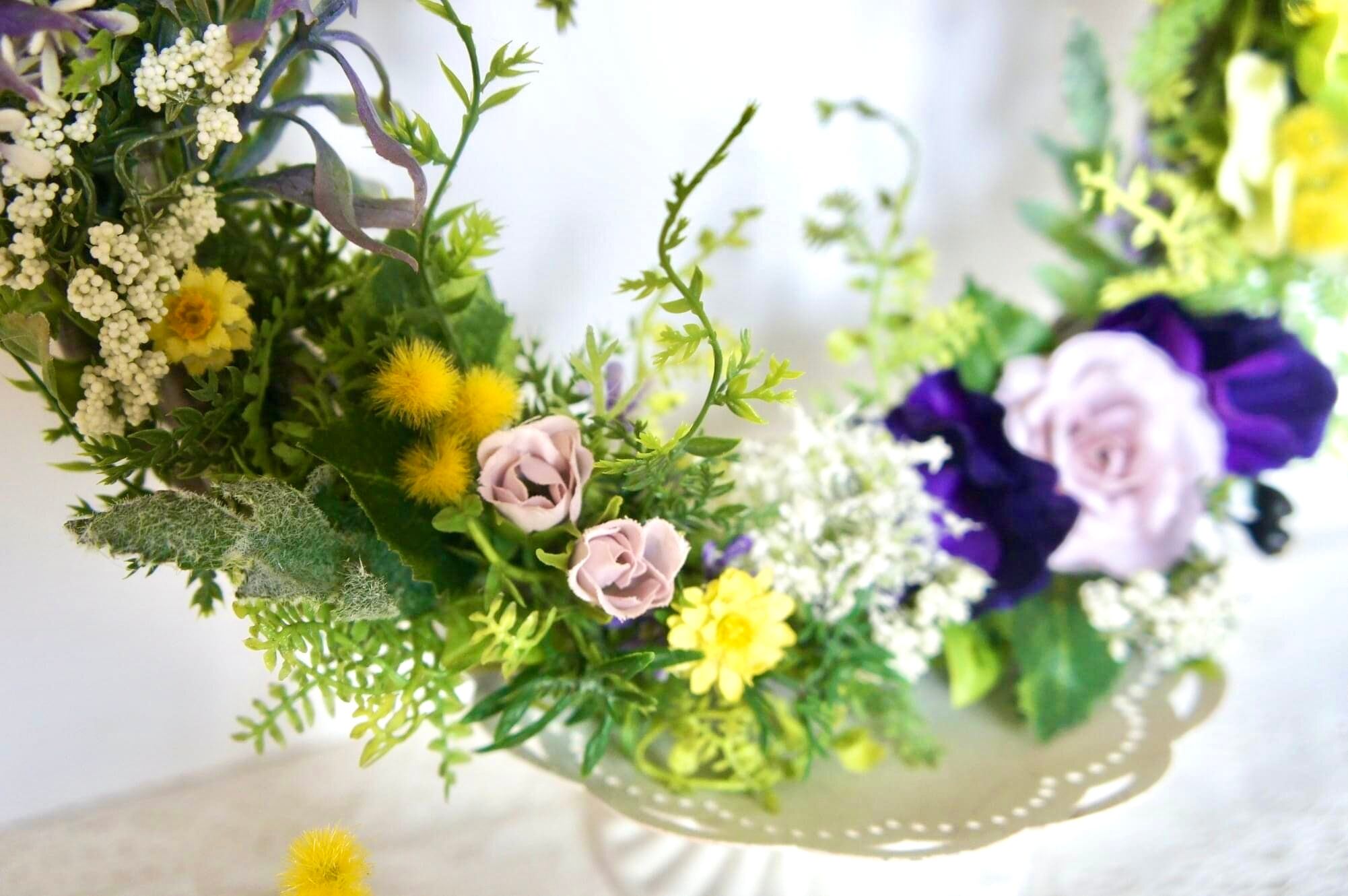 ナチュラルグリーンをベースにパープル、イエロー、ホワイトのお花を配置。