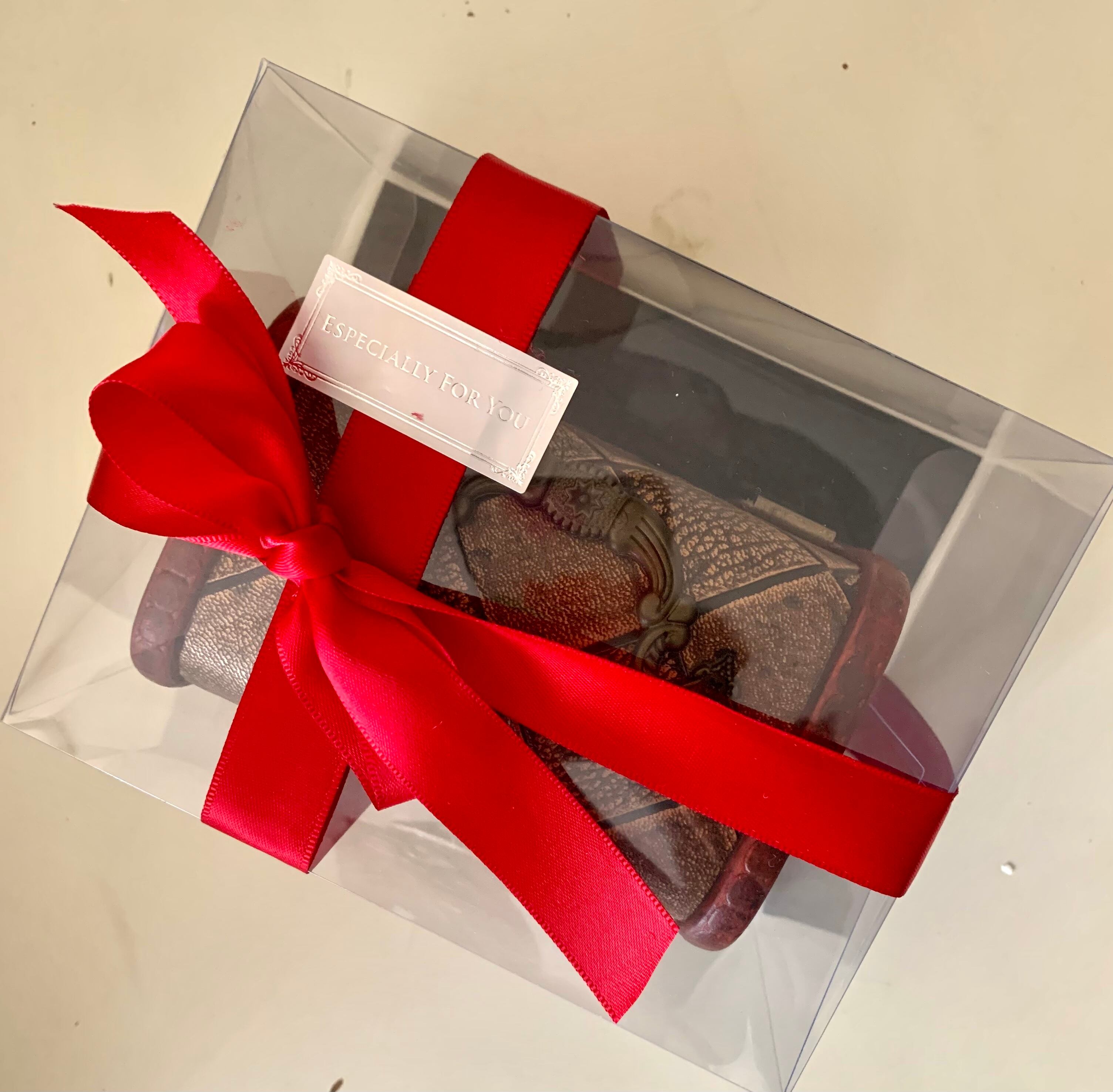セロファンでお包みしリボンをお付けして、クリアケースに入れてお渡し。